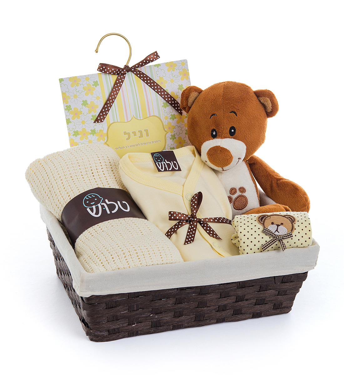 סלסלת ראטן בצבע חום/שמנת מרופדת בבד טבעי, לשלל שימושים, ובתוכה מגוון מוצרים מעוצבים.