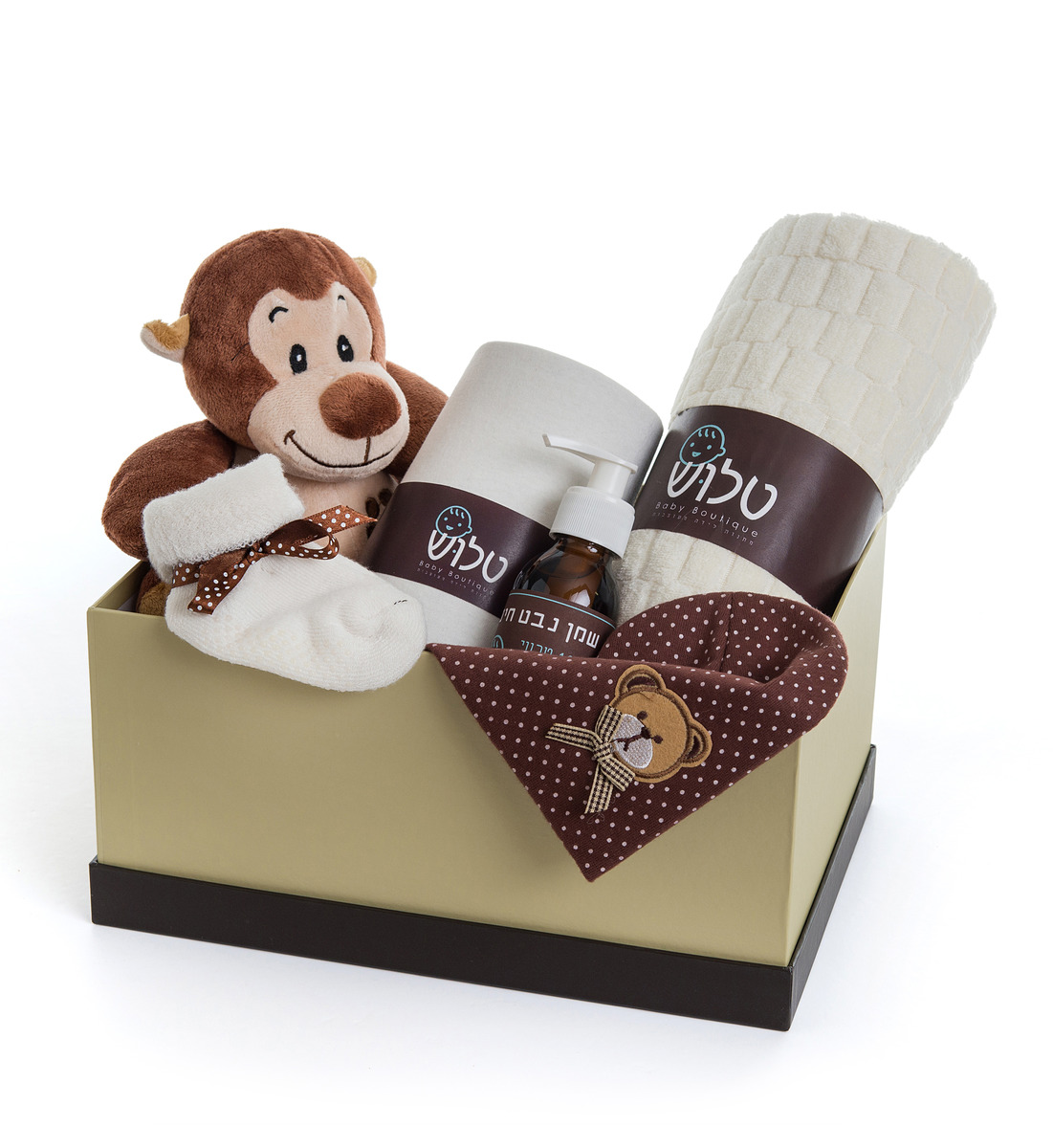 קופסא מהודרת ושימושית ובתוכה מוצרים מעוצבים המשלבים ביניהם פריטים המותאמים במיוחד לתינוקות רכים: